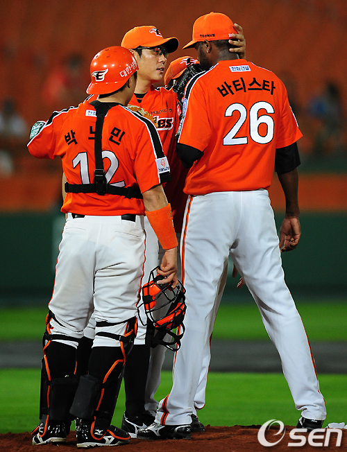 8회말 1사 1루에서 한화 정민철 코치가 마운드에 올라 바티스타와 이야기를 나누고 있다. /jpnews@osen.co.kr