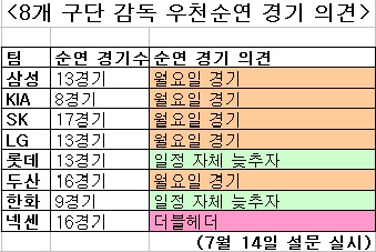 OSEN은 지난 14일 8개구단 감독들에게 '우천으로 연기된 경기를 더블헤더와 월요일 경기 중 어떤 것이 더 낫냐'고 물었다.