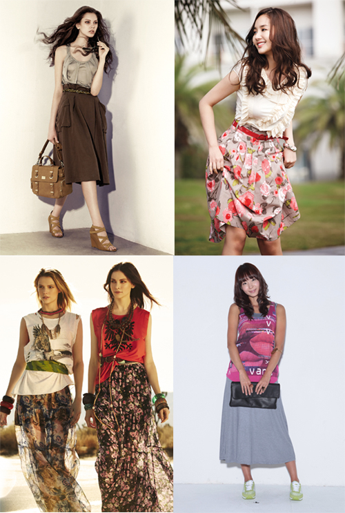 그밖에 내추럴하면서 에스닉한 무드로 매혹시키려면, 옷장에서 방금 꺼내 입은 듯한 민소매 티셔츠에 끝이 보이지 않는 긴 맥시스커트를 더하면, 개성은 덧붙여지고, 여성스러움은 그대로 가져갈 수 있다.