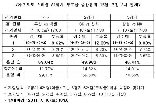 2011 프로야구 3경기 대상 야구토토 스페셜 31회차 투표율 중간집계
