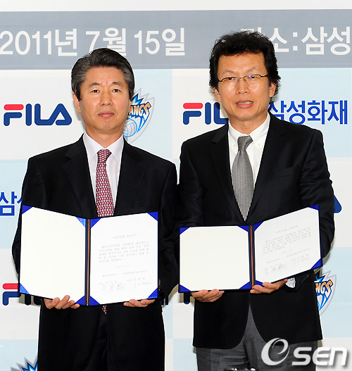 삼성화재 이종성 단장과 필라코리아 이기호 사장이 용품후원 조인식을 갖고 있다. / sunday@osen.co.kr