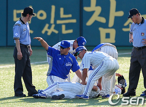 [OSEN=대구,지형준기자] 16일 오후 대구구장에서 열린 '2011 롯데카드 프로야구' 삼성 라이온즈와 KIA 타이거즈의 경기, 3회초 무사에서 삼성 배영섭과 김상수가 KIA 이범호의 타구에 충돌하고 넘어지자 코칭스태프가 들것을 가져오라고 손짓하고 있다. /jpnews@osen.co.kr