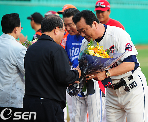 식전행사에서 남부팀 장효조 감독과 북부팀 유승안 감독이 꽃다발을 받고 있다. /rumi@osen.co.kr
