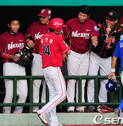 4회초 1사 주자 1루 남부 넥센 정범수의 선취 1타점 3루타때 홈을 밟은 KIA 임한용이 덕아웃에서 동료들과 기쁨을 나누고 있다. /rumi@osen.co.kr