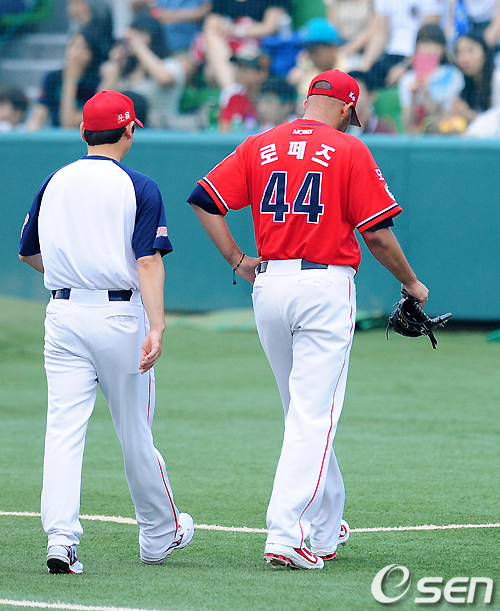 [OSEN=대구,지형준기자] 17일 오후 대구구장에서 열린 '2011 롯데카드 프로야구' 삼성 라이온즈와 KIA 타이거즈의 경기, 2회말 1사 3루에서 KIA 선발투수 로페즈가 옆구리 통증을 호소하며 마운드를 내려가고 있다. 결국 로페즈는 김희걸로 교체됐다. /jpnews@osen.co.kr