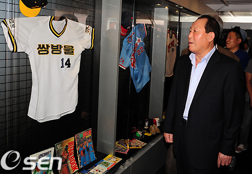 쌍방울 창단 감독이었던 김인식 KBO 규칙위원장이 옛 유니폼을 보며 미소짓고 있다./ jpnews@osen.co.kr