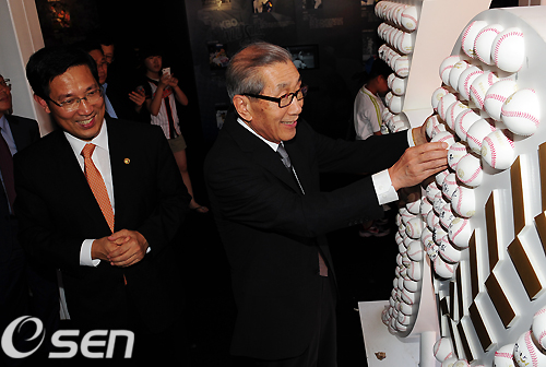박선규 문화관광부 제2차관과 이용일 KBO 총재대행이 이야기를 나누며 전시장을 둘러보고 있다./ jpnews@osen.co.kr
