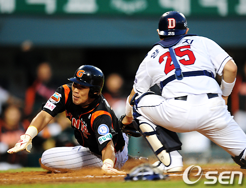 [OSEN=잠실,지형준기자] 20일 오후 잠실구장에서 열린 '2011 롯데카드 프로야구' 두산 베어스와 롯데 자이언츠의 경기, 5회초 2사 2루에서 롯데 전준우가 김주찬의 역전 1타점 적시타에 두산 양의지의 태그를 피해 홈에서 세이프되고 있다. /jpnews@osen.co.kr