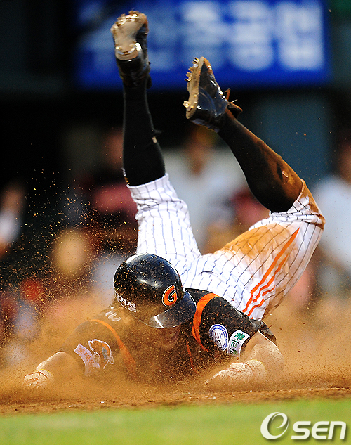 [OSEN=잠실,지형준기자] 20일 오후 잠실구장에서 열린 '2011 롯데카드 프로야구' 두산 베어스와 롯데 자이언츠의 경기, 5회초 2사 2루에서 롯데 전준우가 김주찬의 역전 1타점 적시타에 두산 양의지의 태그를 피해 홈에서 세이프되고 있다. /jpnews@osen.co.kr