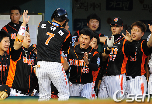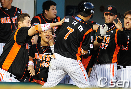 [OSEN=잠실,지형준기자] 20일 오후 잠실구장에서 열린 '2011 롯데카드 프로야구' 두산 베어스와 롯데 자이언츠의 경기, 5회초 2사 1,3루에서 롯데 전준우의 2루 도루에 두산 양의지의 악송구로 홈을 밟은 문규현이 더그아웃에서 동료선수들과 하이파이브를 하고 있다. 이대호가 문규현의 머리를 치려하자 문규현이 이를 알아 차리고 피하고 있다./jpnews@osen.co.kr