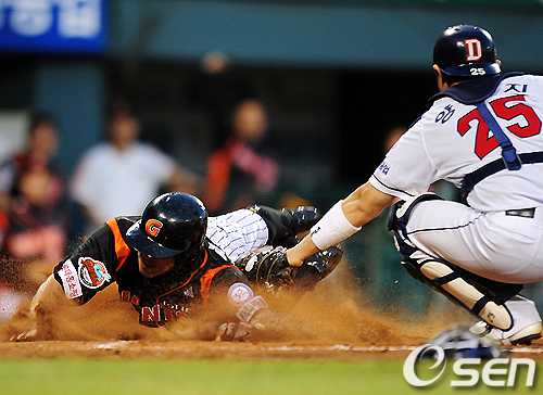 [OSEN=잠실,지형준기자] 20일 오후 잠실구장에서 열린 '2011 롯데카드 프로야구' 두산 베어스와 롯데 자이언츠의 경기, 5회초 2사 2루에서 롯데 전준우가 김주찬의 역전 1타점 적시타에 두산 양의지의 태그를 피해 홈에서 세이프되고 있다. /jpnews@osen.co.kr