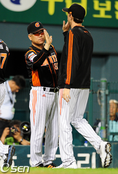 승리한 롯데 양승호 감독과 사도스키가 하이파이브를 하고 있다. /jpnews@osen.co.kr