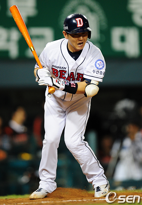 9회말 2사에서 대타로 들어선 두산 손시헌이 롯데 이명우의 투구에 맞고 괴로워하고 있다. /jpnews@osen.co.kr