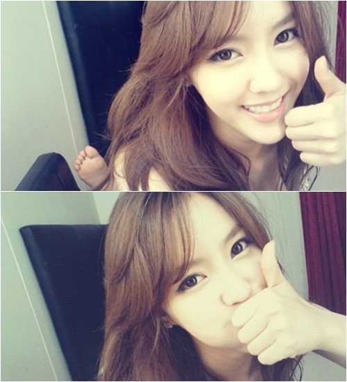효민은 22일 오후 자신의 트위터에 "충전 완료~ 헉! 근데 뒤에 발 하나"란 글과 함께 사진 두 장을 게재했다. 사진 속 효민은 엄지 손가락을 치켜들고 밝게 웃는 모습과 건강한 혈색을 자랑한다. 엄지 손가락을 치켜 든 모습