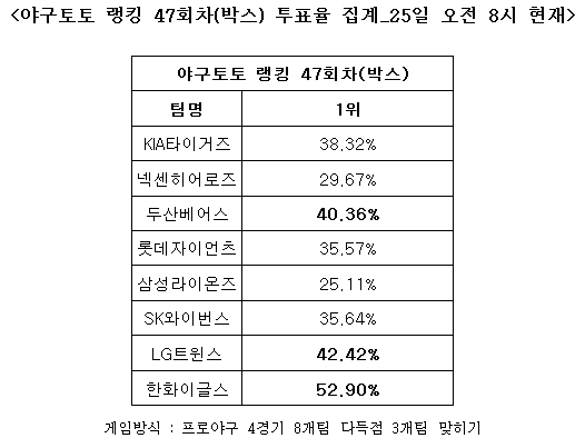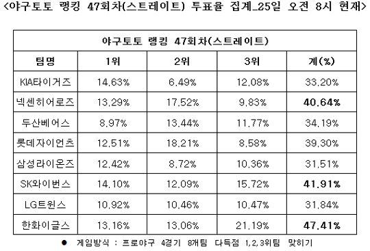 2011 프로야구 대상 야구토토 랭킹 47회차 투표율 중간집계 결과