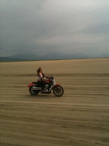 사진 속 가희는 넓은 땅을 오토바이를 타고 가로지르는 모습이다. 긴 머리를 휘날리며 오토바이를 타는 모습이 눈에 띈다.
