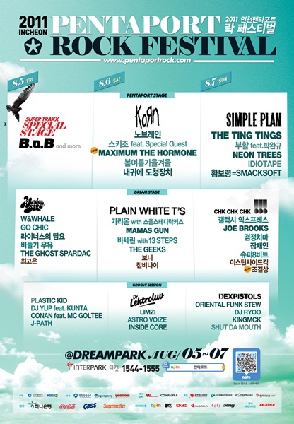 오는 8월 5일에서 7일까지 열리는 펜타포트 락페스티벌에는 뉴 메탈의 지존인 '콘(Korn)'을 비롯해, 영국의 대표적 댄스팝 듀오 팅팅스 (The TingTings), 박재범이 리메이크해 화제를 모았던 '낫싱 온 유(Nothin' on you)의 주인공 비오비(B.O.B), 캐나다 펑크록 밴드 '심플 플랜 (Simple Plan)' 등이 무대에 선다.