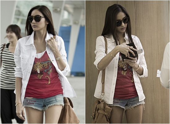 이날 한채영은 큐빅이 박힌 레드티셔츠와 화이트 셔츠를 롤업, 데님매니아를 입증하듯 ‘I love joey’라는 문구가 새겨진 핫팬츠로 연출해 더운 여름에 시원해 보이는 핫 썸머룩을 선보였다. 여기에 이른 오전 시간대의 출국을 위해 오버사이즈 선글라스를 착용하는 센스를 발휘해 내추럴하면서도 센스 있는 공항 패션을 연출했다.