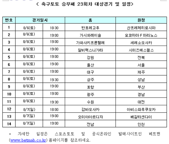 국민체육진흥공단(www.kspo.or.kr)이 발행하는 체육진흥투표권 수탁사업자인 스포츠토토의 공식 온라인 발매 사이트 베트맨(www.betman.co.kr)이 오는 6일, 7일 열리는 국내프로축구 K-리그 8경기와 일본프로축구 J리그 6경기 등 총 14경기를 대상으로 축구토토 승무패 23회차 게임을 발행한다고 밝혔다.