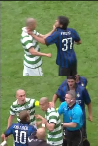 이어 인터 밀란의 미드필더 웨슬리 스네이더(27)도 차두리의 목을 감싸쥐며 차두리를 자극했다. 차두리가 손가락으로 스네이더를 가리키며 조심하라고 경고하는 사이 이번에는 공격수 지암파올로 파치니(27)가 옆에 있던 공을 차두리 쪽으로 차며 신경을 건드렸다.