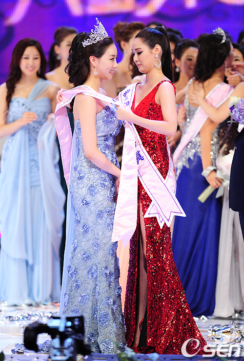 미스코리아 진에 오른 이성혜가 전년도 진 정소라에게 리본을 받고 있다. / sunday@osen.co.kr