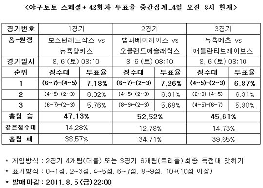 국민체육진흥공단(www.kspo.or.kr)이 발행하는 체육진흥투표권 수탁사업자인 스포츠토토 공식 온라인 발매 사이트인 베트맨(www.betman.co.kr)이 오는 6일 열리는 미국프로야구(MLB) 3경기를 대상으로 한 야구토토 스페셜+ 42회차 투표율을 중간집계한 결과, 국내 야구팬 47.13%는 보스턴 레드삭스-뉴욕 양키스(1경기)전에서 홈팀 보스턴의 승리를 예상했다.
