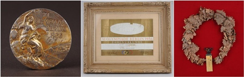 <사진> 손기정의 베를린올림픽 마라톤 우승기념품 중 그리스 투구(위)와 금메달, 우승 상장, 월계관.