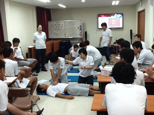 대한적십자회의 원종순씨는 두 시간여 동안 심폐소생술의 이론적인 내용과 실습을 통해 선수들을 교육했다. PPT와 영상 자료를 통해 심폐소생술의 원리와 방법, 국내외 경기 중에 있었던 응급상황에 대한 조치를 영상물을 통해 확인한 후, 애니(교육용 인형)를 통해 실제로 실습해보면서 각종 유의 사항과 실수하기 쉬운 점들을 교정해가면서 즐겁게 교육을 마쳤다.