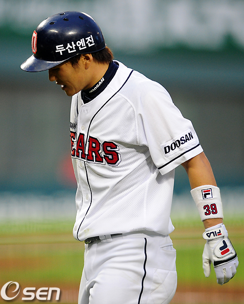 [OSEN=잠실,지형준기자] 10일 오후 잠실구장에서 열린 '2011 롯데카드 프로야구' 두산 베어스와 SK 와이번스의 경기, 3회말 무사 1루에서 두산 이종욱이 내야땅볼로 물러나며 옆구리를 만지고 괴로워하고 있다. 이종욱은 2회초 수비에서 SK 허웅의 타구를 잡으려고 몸을 날리다 옆구리 통증으로 응급치료를 받은 바 있다. 결국 이종욱은 정진호로 교체./jpnews@osen.co.kr