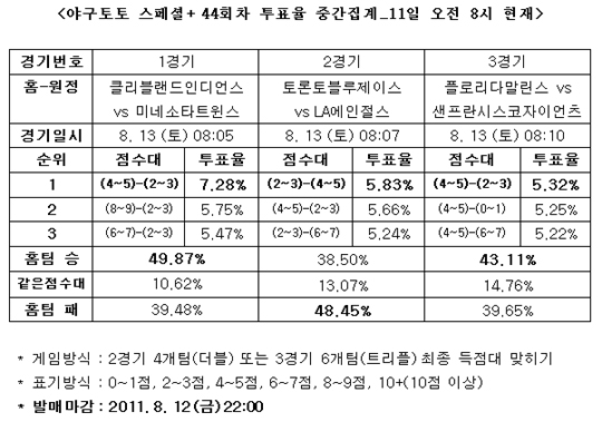 MLB 3경기 대상 야구토토 스페셜+ 44회차 투표율 중간집계