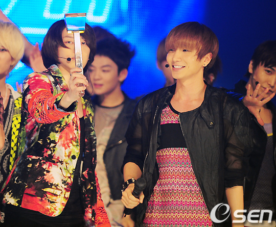 슈퍼주니어의 김희철이 엠카 1위 트로피를 거꾸로 들고 인사를 하고 있다./ rumi@osen.co.kr