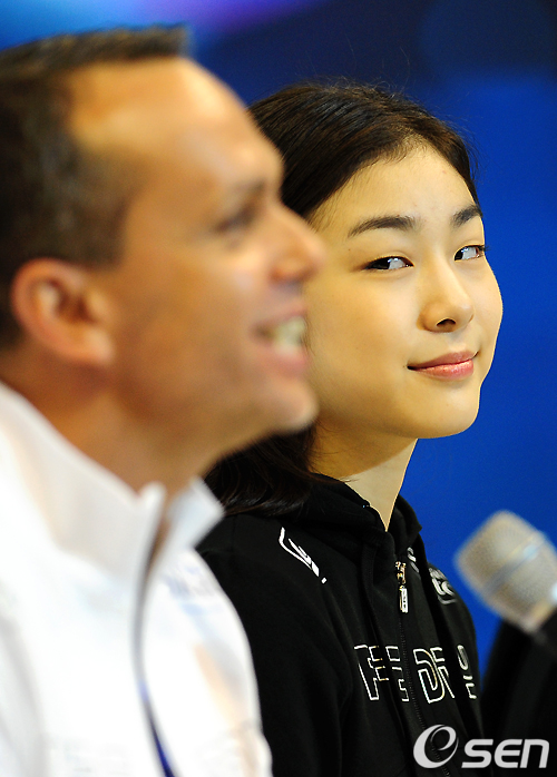 김연아가 취재진의 질문에 답을 하는 안무가 데이빗 윌슨을 바라보고 있다. / sunday@osen.co.kr