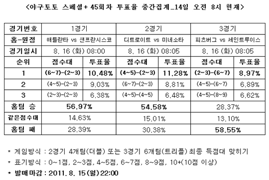 MLB 3경기 대상 야구토토 스페셜 + 45회차 투표율 중간집계 결과