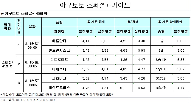 [야구토토] 국민체육진흥공단(www.kspo.or.kr)이 발행하는 체육진흥투표권 수탁사업자인 스포츠토토 공식 온라인 발매 사이트인 베트맨(www.betman.co.kr)이 16일에 열리는 미국프로야구(MLB) 3경기를 대상으로 한 야구토토 스페셜+ 45회차 투표율 중간집계 결과, 국내 야구팬의 56.97%는 애틀란타-샌프란시스코(1경기)전에서 댄 어글라의 활약을 앞세운 홈팀 애틀란타의 승리를 예상하는 것으로 나타났다.