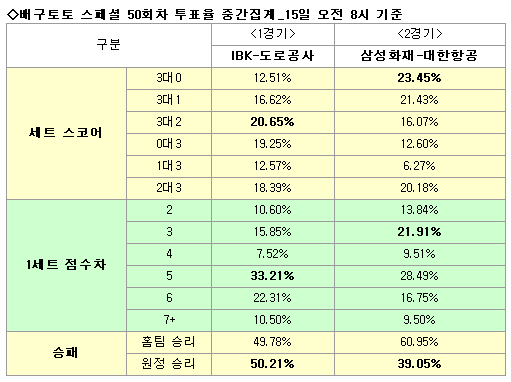2011 KOVO컵대회 대상 배구토토 스페셜 50회차 투표율 중간집계 결과 도로공사, 삼성화재 승리 전망…16일(화) 오후 3시50분 마감