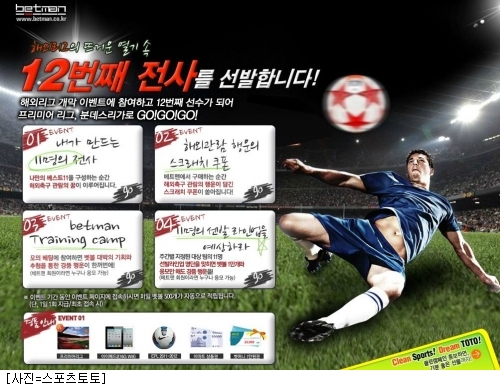 해외프로축구 2011~2012시즌 본격 개막을 맞아 '12번째 전사를 선발합니다'라는 이름으로 진행되는 이번 이벤트는 내가 만드는 11명의 전사, 해외축구 관람 행운의 스크래치 쿠폰, 베트맨 트레이닝캠프, 11명의 선발라인업을 예상하라 등 4가지 방식으로 진행된다.