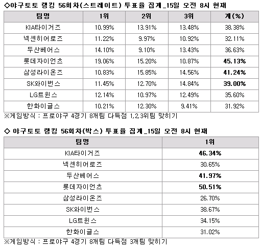 한편, 순위에 상관없이 다득점 3개팀을 맞히는 '박스' 게임에서는 롯데(50.51%), KIA(46.34%), 두산(41.97%)이 가장 많은 득점을 기록할 것으로 집계됐다. 다득점 가능성 하위 예상팀으로는 넥센(30.65%)과 삼성(26.70%)이 꼽혔다.
