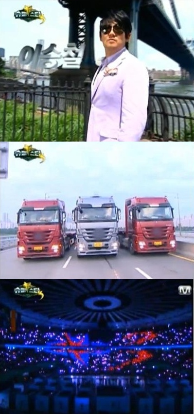 볼수록 궁금증을 낳게 하는 장면은 또 있다. ‘슈퍼스타K’ 로고가 그려진 자동차 20대와 트레일러 3대가 다리 위를 나란히 달리는 모습이다.
