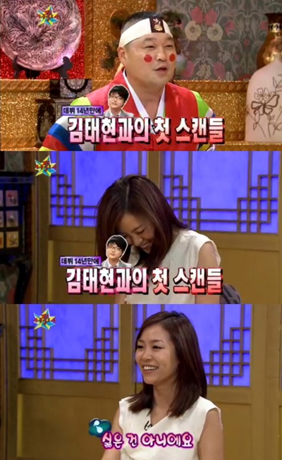 18일 MBC '황금어장' 출연한 박정현은 강호동이 "'나가수' 출연과 동시에 14년만에 스캔들이다"며 김태현과의 스캔들을 언급하자, "그거 스캔들이라 불러야 하냐"며 웃었다.