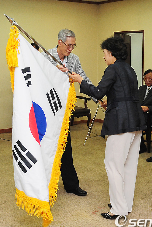 강현숙 여자농구 국가대표단장이 단기를 수여받고 있다. / baik@osen.co.kr