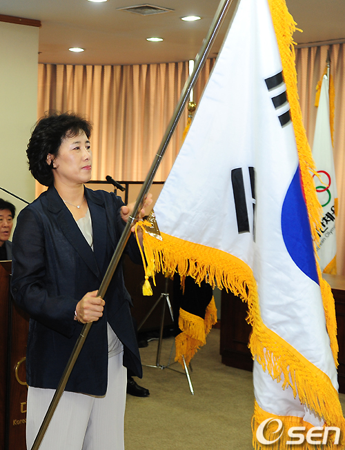 강현숙 대표팀 단장이 단기를 흔들고 있다. / sunday@osen.co.kr