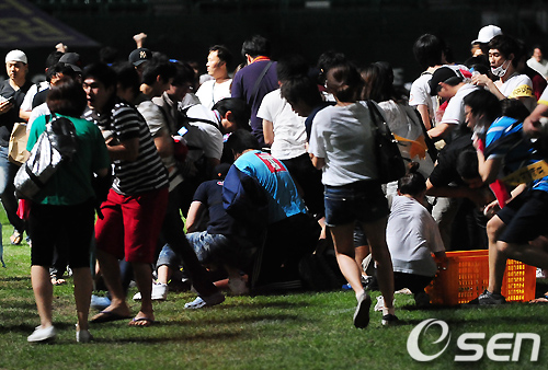 경기를 마치고 김성근 감독의 사퇴에 항의하는 수많은 SK 팬들이 경기장으로 난입해 덕아웃을 습격, 볼을 훔치고 심지어 던지고 있다 . / rumi@osen.co.kr