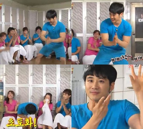 백도빈은 MC 유재석의 권유로 부끄럽게 춤을 추려 나섰고 이어 우스꽝스런 모습으로 '쏘리쏘리'를 선보였다.