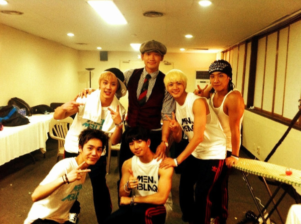 사진 속 지오는 엠블랙 멤버들과 그 사이에 있는 비와 함께 포즈를 취한 모습이다.
