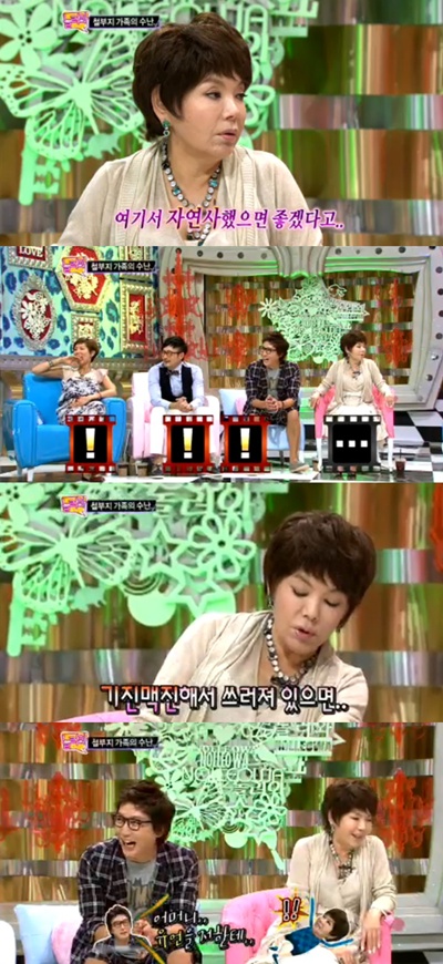 김수미는 "힘들었지만 탁재훈 때문에 버텼다. 지쳐서 한쪽에 누워 있으면 탁재훈이 다가와 '엄마, 유언은 나에게 말씀해 주세요'라고 하는데 빵 터졌다. 웃다보면 힘이 났다"고 탁재훈을 칭찬했다.