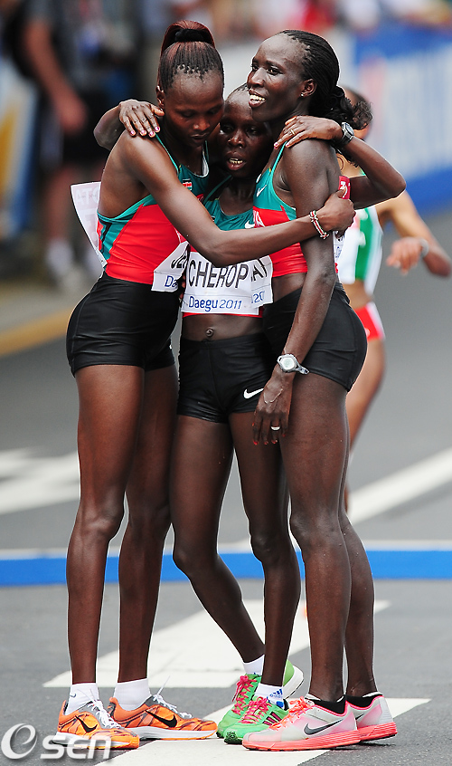 케냐의 1,2,3위로 각각 결승점을 밟은 에드나 키플라갓, 프리스카 젭투, 샤론 체로프(오른쪽부터)가 결승점 앞에서 포옹을 하고 있다./ rumi@osen.co.kr