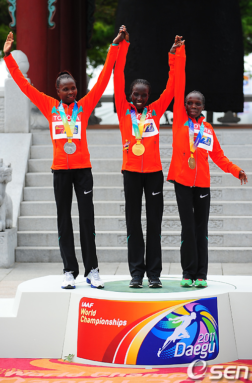 케냐의 1,2,3위로 각각 결승점을 밟은 에드나 키플라갓, 프리스카 젭투, 샤론 체로프가 함께 환호하고 있다./ rumi@osen.co.kr