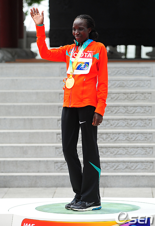 1위로 결승점을 밟은 에드나 키플라갓이 단상에서 손을 흔들고 있다./ rumi@osen.co.kr