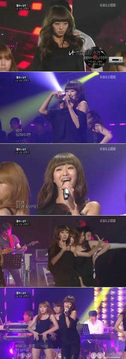 이날 방송에서 효린은 김완선의 3집 앨범 타이틀곡인 '나홀로 춤을 추긴 너무 외로워'를 선곡해 무대에 올랐다.