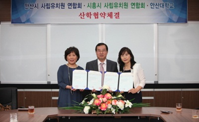 안산대학교는 지난 26일 본관 소회의실에서 안산시 및 시흥시 사립유치원연합회와의 산학협력을 체결하는 협약식을 가졌다. 이번 협약으로 유아교육과 전공심화과정 설치에 따른 학생지원, 현장실습, 연수, 위탁교육 지원에 대해 적극 협력하기로 약속했다.